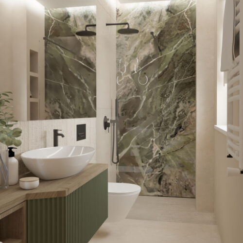 Łazienka w naturalnych kolorach – beżowy z mocnym zielonym akcentem. Niewątpliwie sprzyja relaksowi i odprężeniu. Nawet niewielkie pomieszczenie może dać nam te przyjemne odczucia…Jakie kolory łazienki masz dziś w głowie