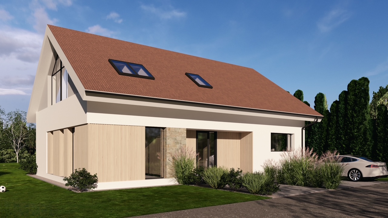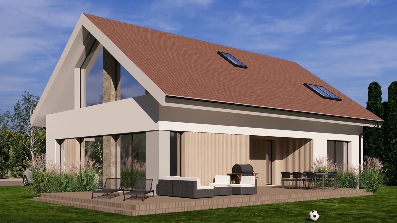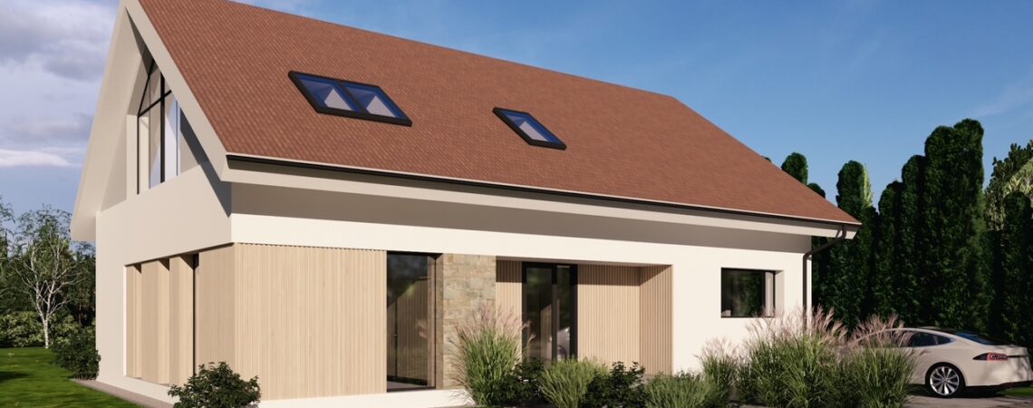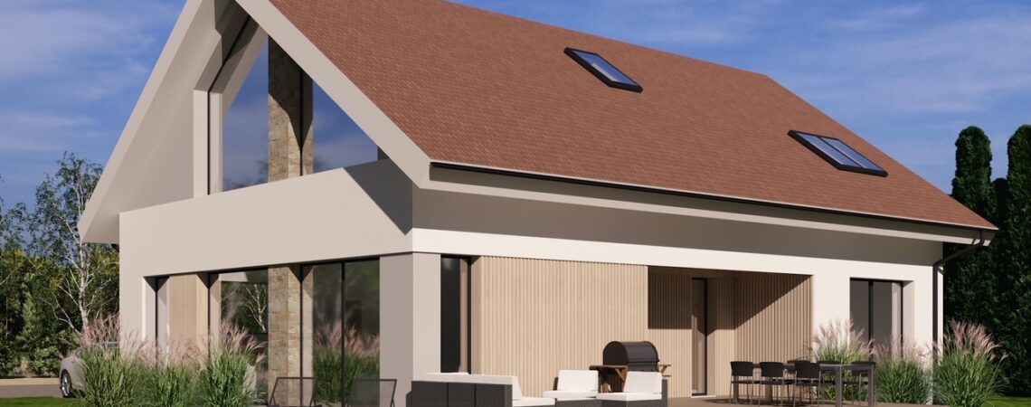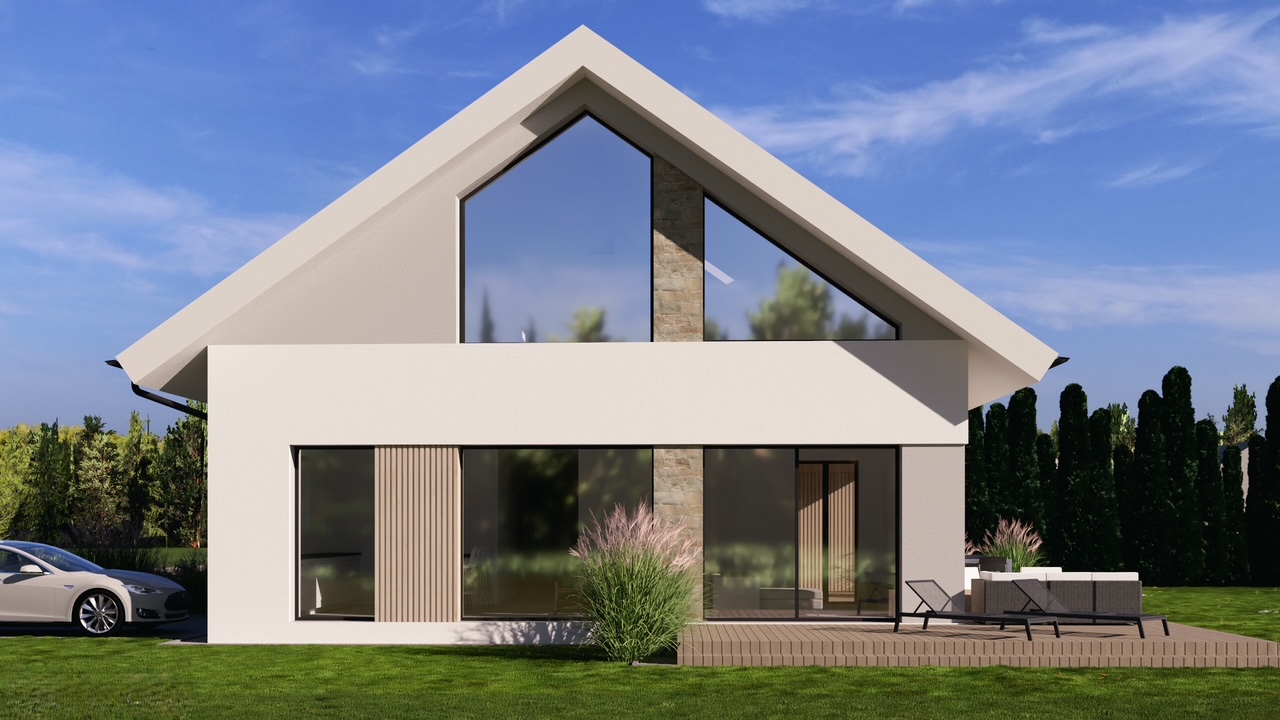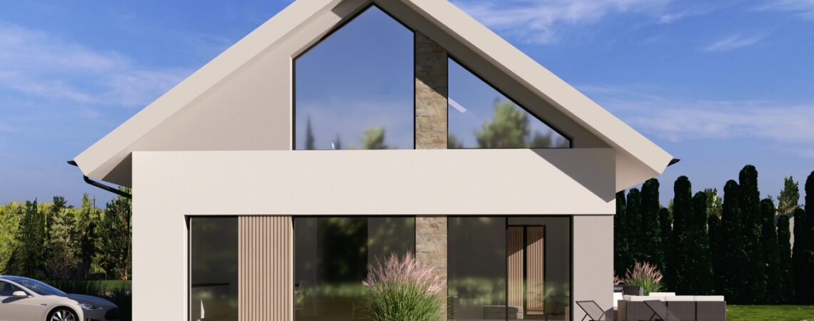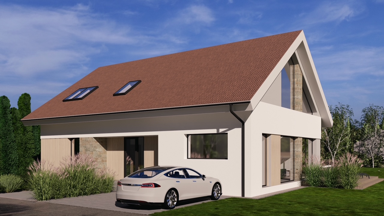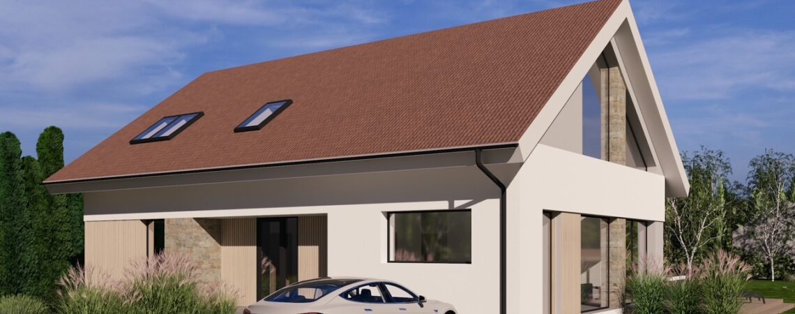 Projekt tego nowoczesego domu nazwaliśmy „Dom Pastelowy”. Powstanie w Jaszkowie niedaleko Śremu jako budynek w formie „nowoczesnej stodoły” z dwuspadowym dachem. Został zaprojektowany na terenie objętym planem miejscowych z dość restrykcyjnymi wytycznymi dotyczącymi kstałtu, formy dachu, koloru elewacji , a nawet odcienia dachówki. W efekcie uzyskaliśmy funkcjonalny, nowoczesny i ciepły w odbiorze domek dla 4 osobowej rodziny. Czekamy na pozolenie na budowę. 🙂