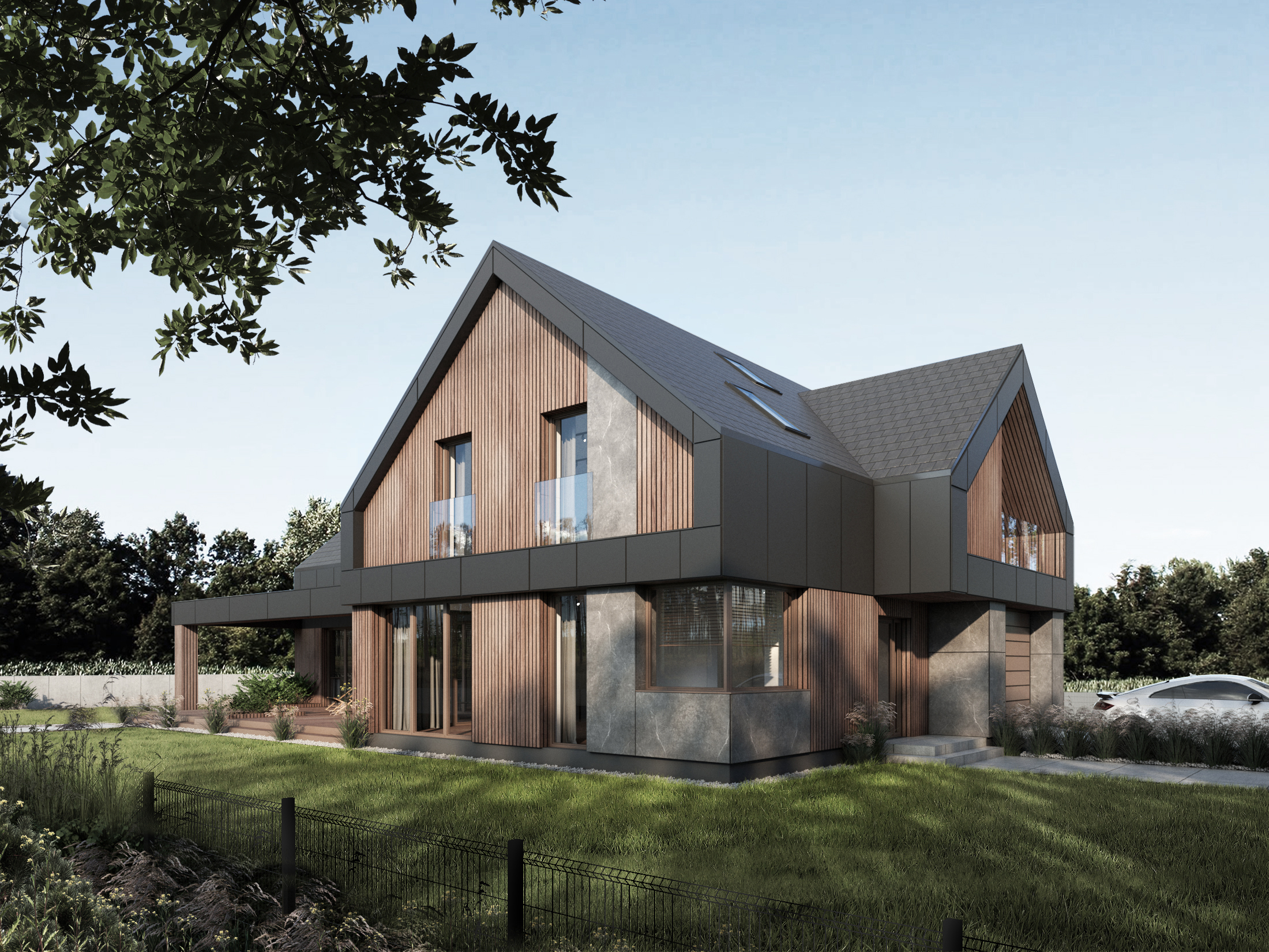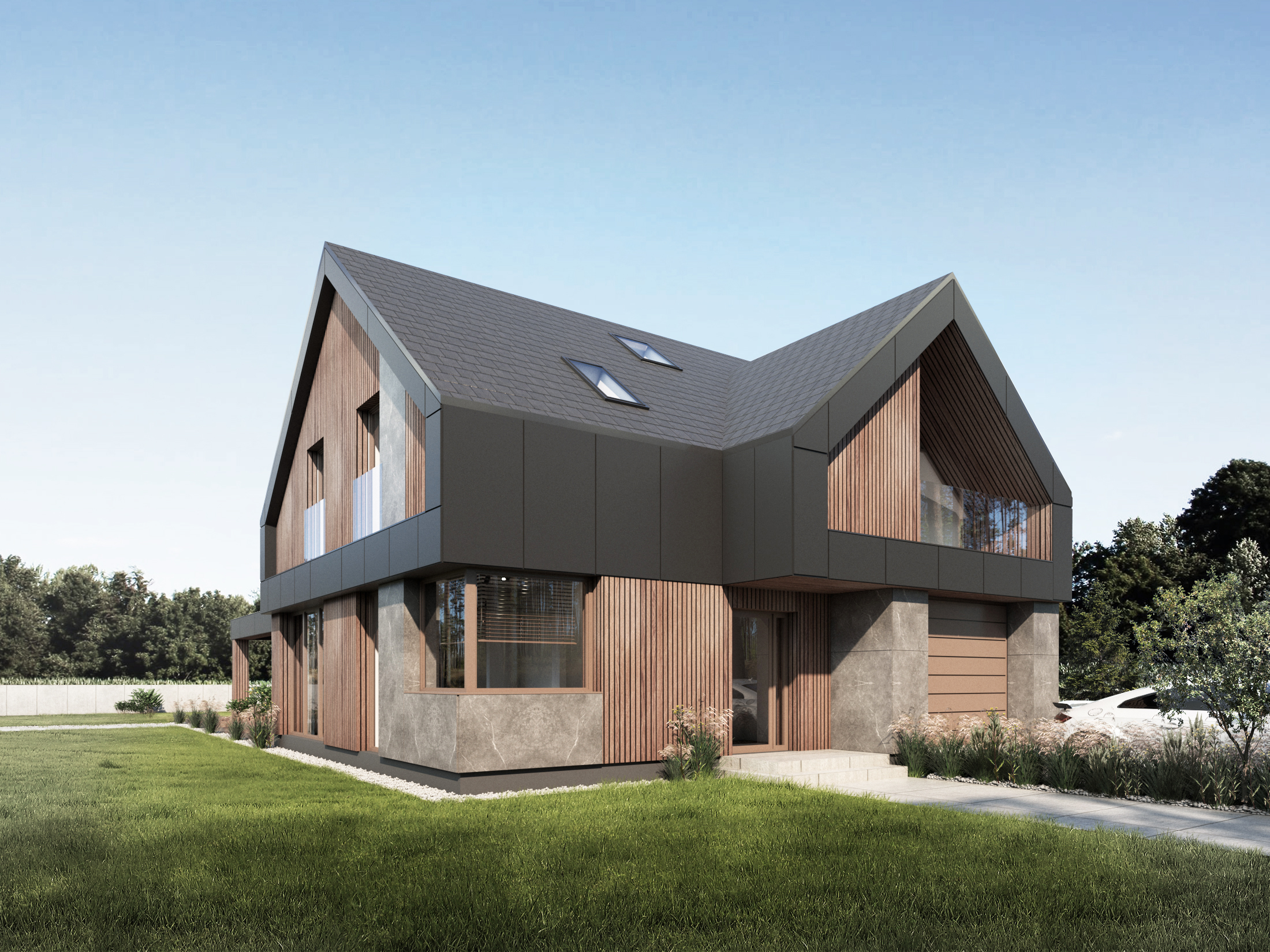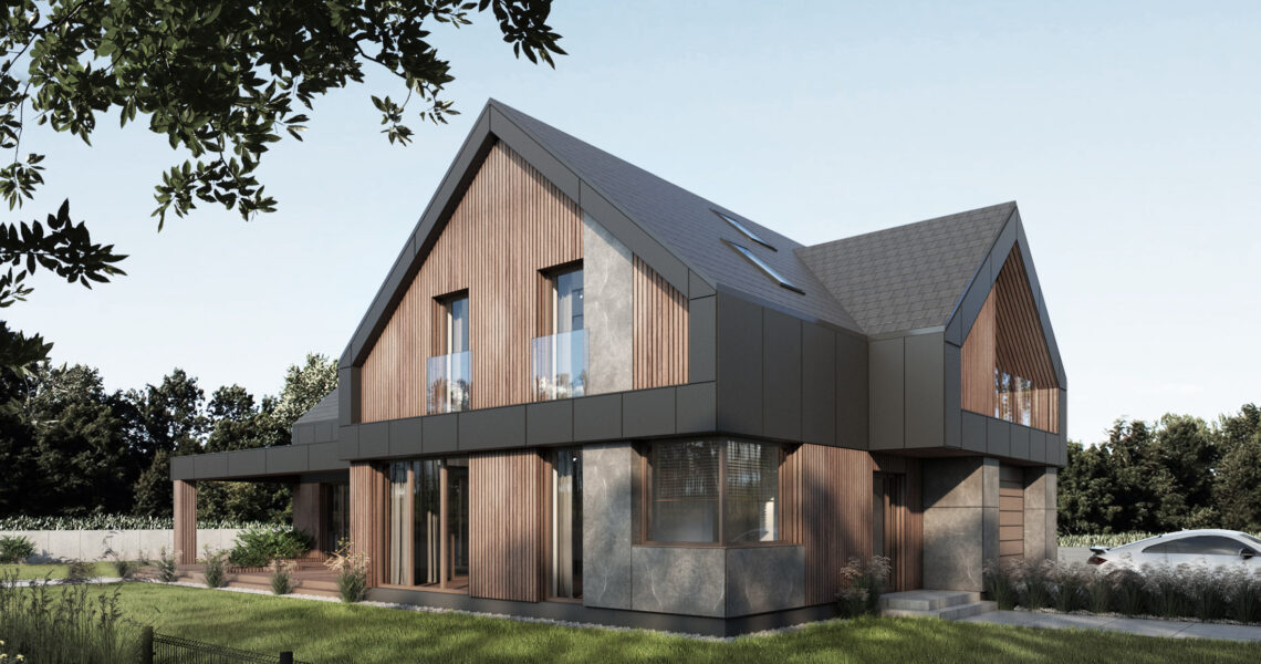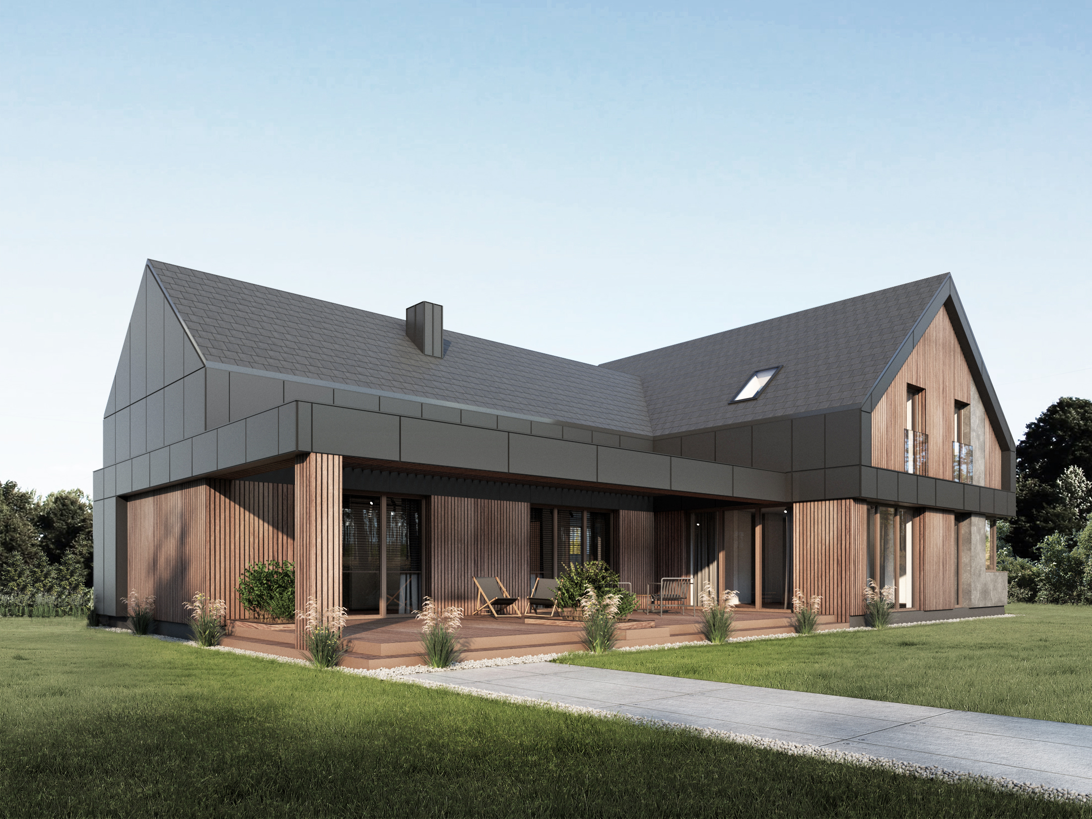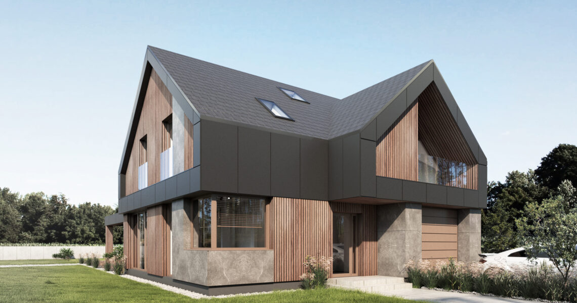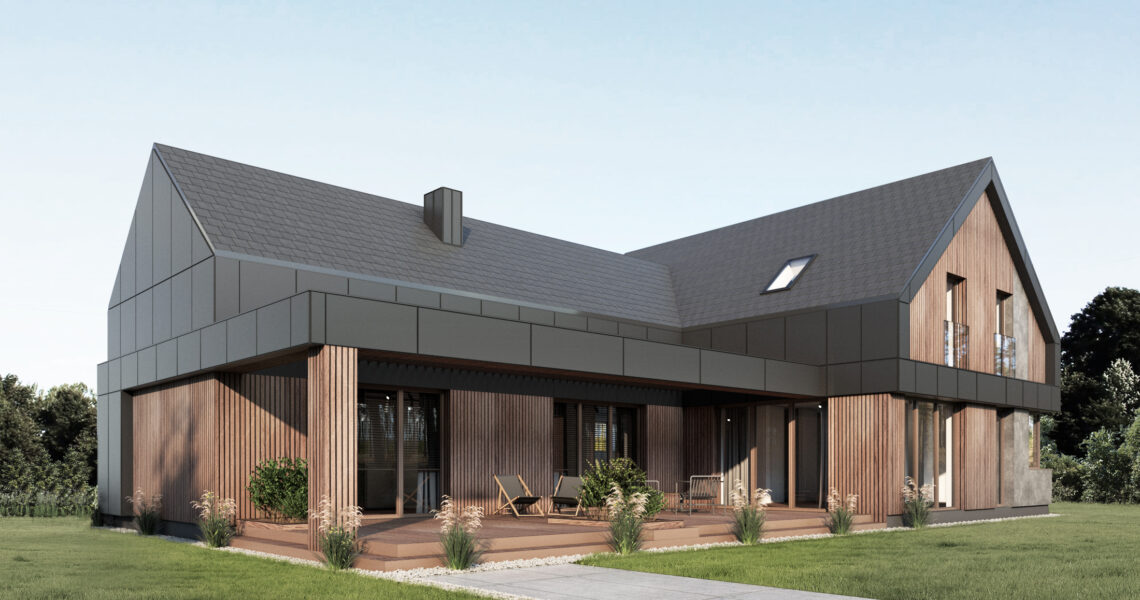 Projekt domu w Błażejewku. Budynek na planie litery L, w którym zaprojektowaliśmy elewacje z ciemnych płyt włókno-cementowych oraz drewnianych lameli.